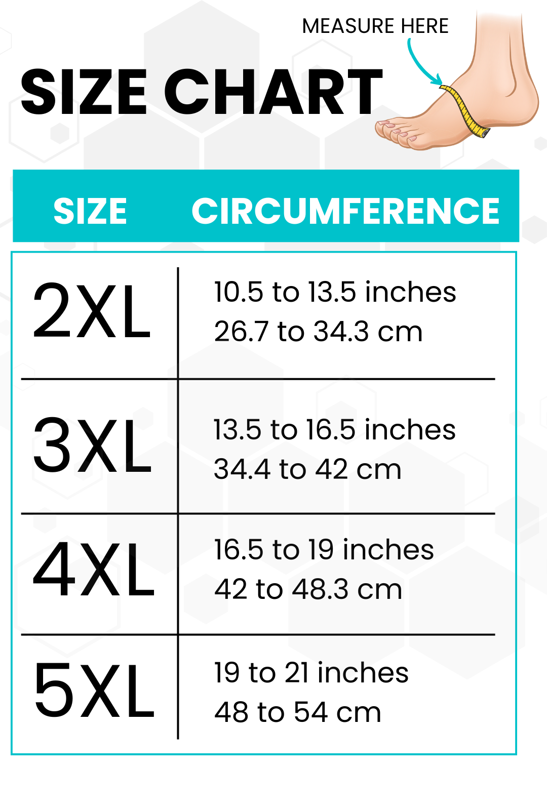 The LymfoSocks stretch up to 20 inches in circumference without pinching or restricting circulation. They are made to fit all leg sizes comfortably and can be worn all day and night.