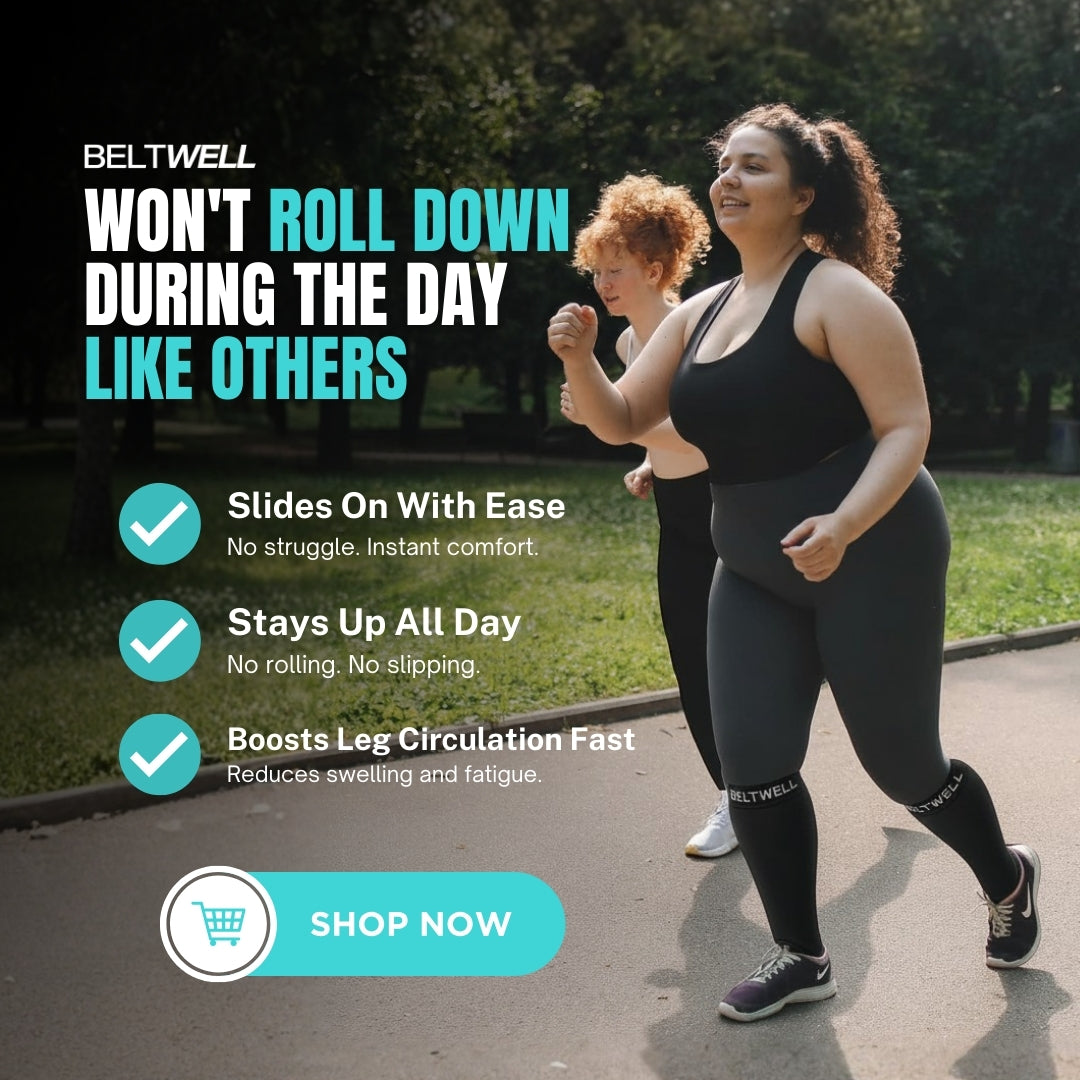 Most compression socks are tight, roll down, or dig into your legs. Beltwell’s Wide Compression Socks are made with soft, extra-stretch fabric that fits comfortably around larger calves and swollen legs — giving you real support without pressure or pain.